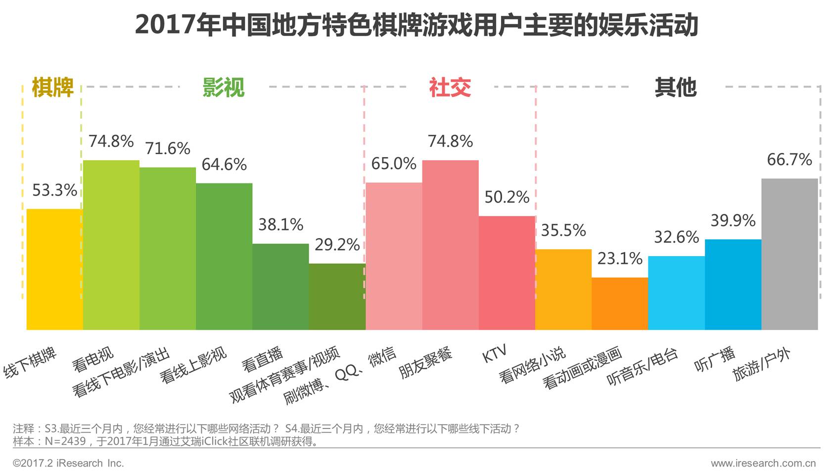 除游戏外,中国地方特色棋牌游戏用户的娱乐活动多在视频和社交方面。
