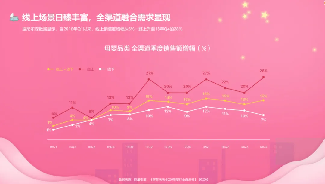 据尼尔森数据显示,自2016年Q1以来,母婴线上销售额增幅从5%一路上升至18年Q4的28% 。得益于线上场景日臻丰富,全渠道融合需求显现,除了综合电商以外,内容电商、社交电商以及品牌自建电商等各类新场景,逐渐被用户认可、使用。