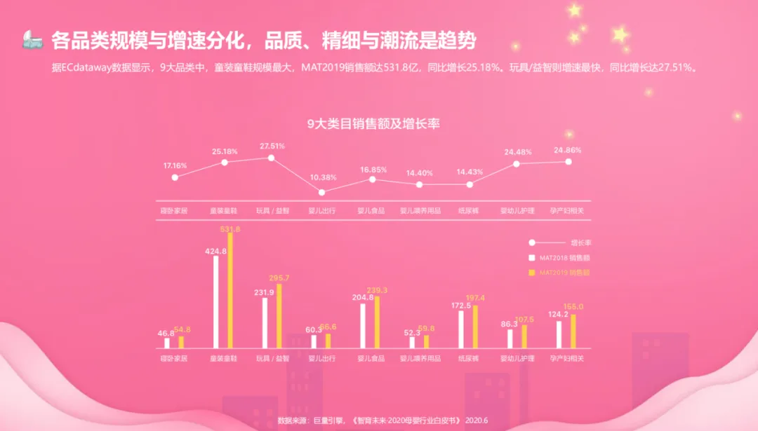 从母婴9大细分类目线上发展来看,童装童鞋的规模是最大的,在2019年的销售额有531.8亿元,同比增长了25.18%;玩具/益智则增速最快,同比增长达27.51%。各品类规模与增速分化,品质、精细与潮流是趋势。