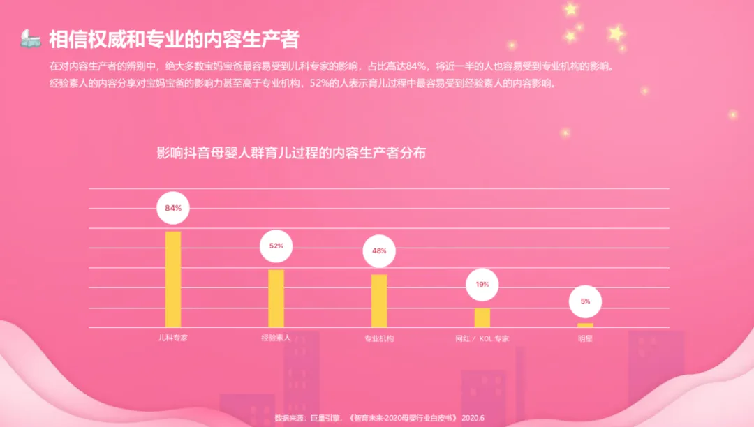 互联网促进了大众共同生活体验的分享,极大的拉近了人与人之间的心理距离。现在很多素人们会通过短视频直播进行一些非常真实且真诚的育儿分享,让他们能够深入到宝爸宝妈的内心,数据显示,经验素人的内容分享对宝妈宝爸的影响力甚至高于专业机构,52%的人表示育儿过程中最容易受到经验素人的内容影响。