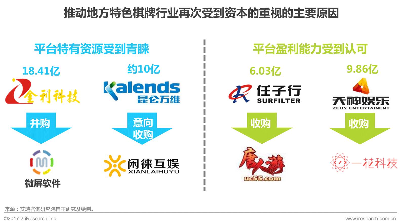 之前已经提到国内资本市场在过去的几年中已经发起了多起针对棋牌公司的大规模收购。据艾瑞咨询统计,其中至少有4例收购意向是针对地方特色棋牌游戏平台的。由此可见,地方特色棋牌行业在经历了多年的沉寂之后再迎资本投资热潮。
