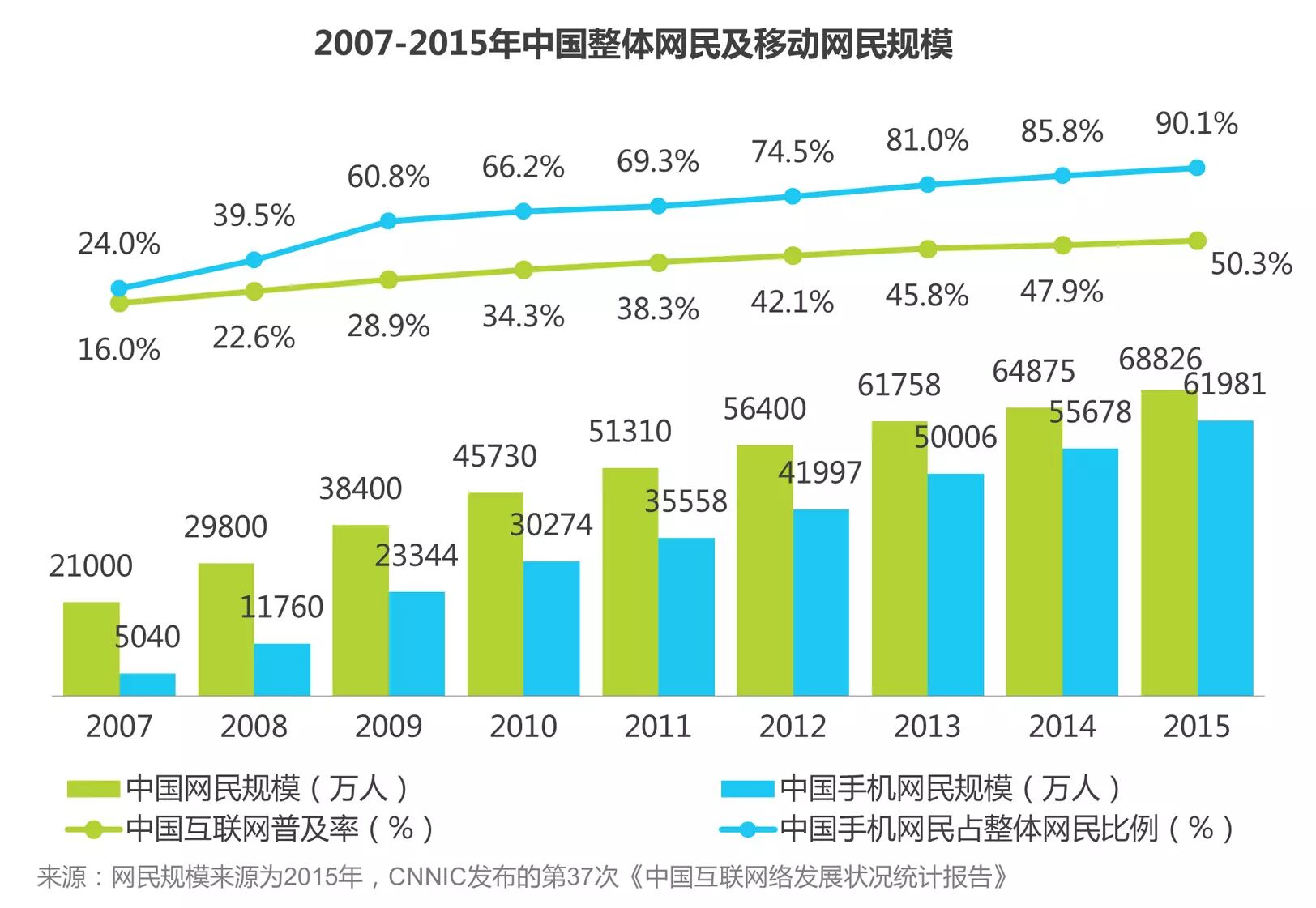 根据艾瑞整理CNNIC最新数据显示,截至2015年12月,我国网民规模近6.9亿,全年共计新增网民3951万人,增长率为6.1%,较2014年提升1.1个百分点。我国互联网普及率达到50.3%,超过全球平均水平3.9个百分点,超过亚洲平均水平10.1个百分点 。