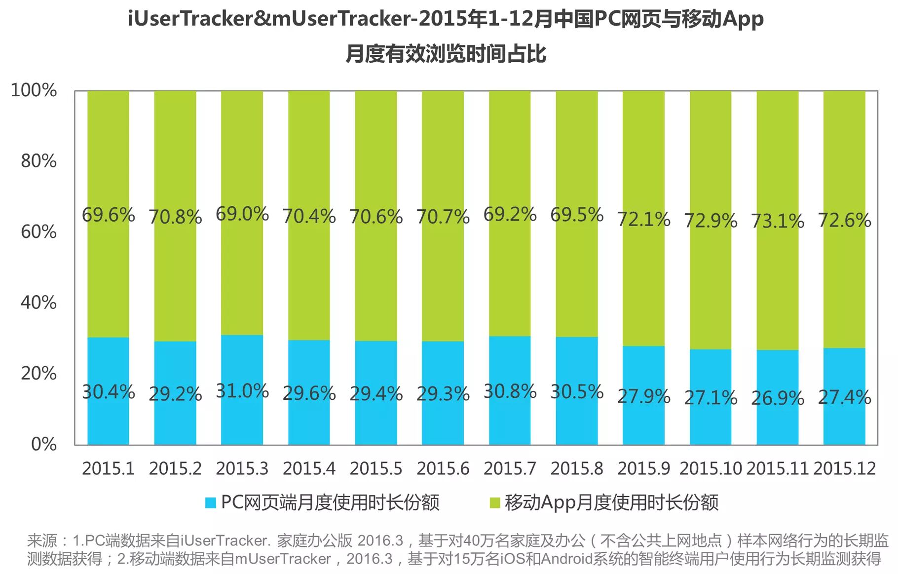 根据艾瑞网民行为监测系统iUserTracker以及移动网民行为监测系统mUserTracker的监测数据显示,移动端月度有效浏览时间超过PC端使用时长的2倍。当前PC端使用时长已趋平稳,移动端则仍在以较高速度增长,未来网民对于移动端的依赖还将进一步加强。