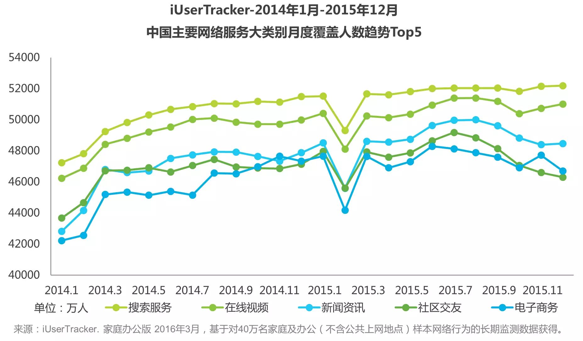 根据艾瑞咨询PC端连续监测产品iUserTracker数据显示,截止2015年12月,搜索服务和在线视频这两类服务自2014年以来一直稳居用户量最大的两类网络服务,在线视频、搜索服务月度覆盖人数趋势保持较为平稳的增长。新闻资讯及电子商务发展最快,新闻资讯月度覆盖人数达到4.8亿人,电子商务服务达4.6亿人,增长速度分别为13.2%和10.6%。