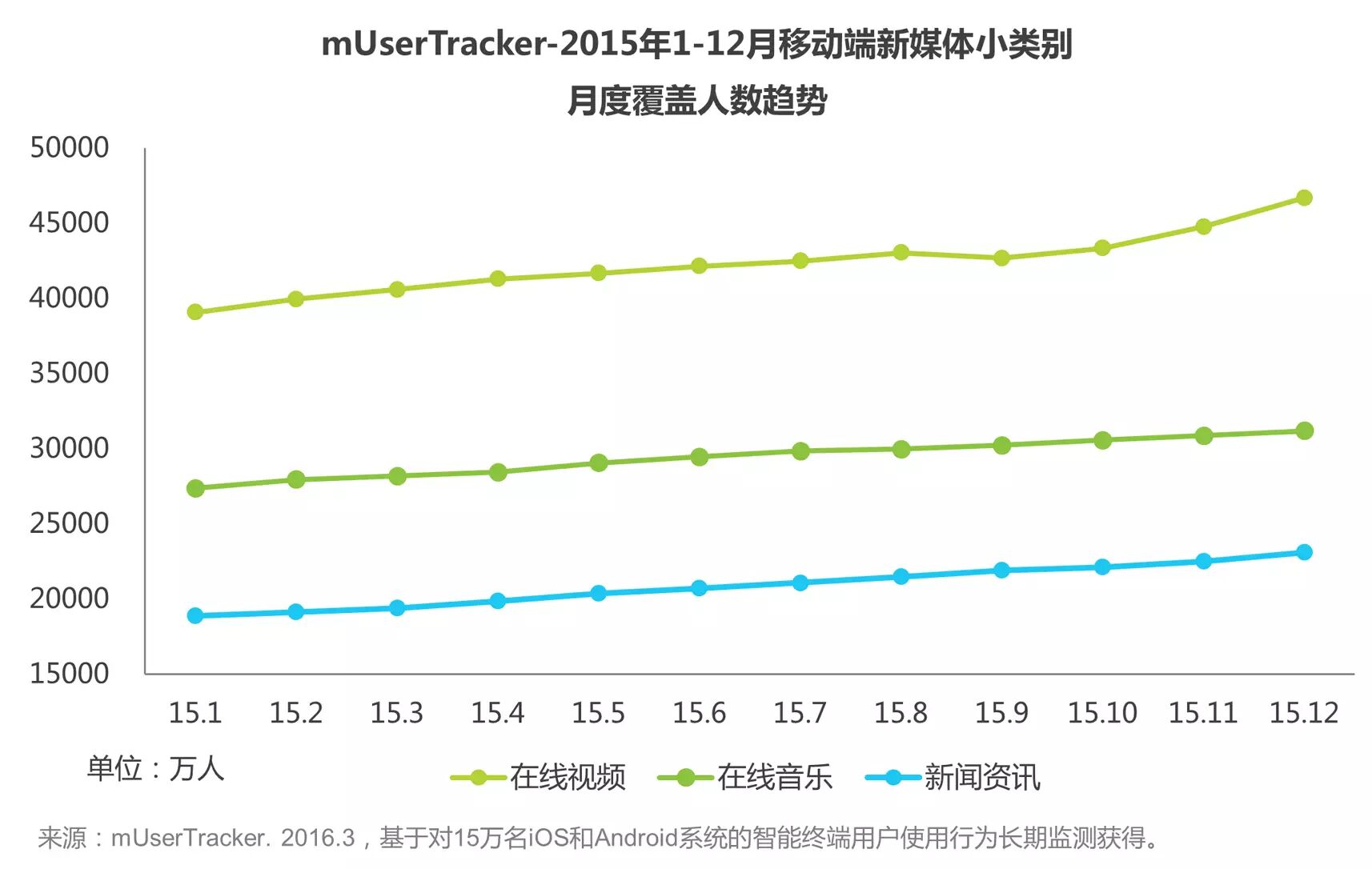 根据艾瑞咨询移动端连续监测产品mUserTracker数据显示,新媒体三大类别——在线视频、在线音乐和新闻资讯在2015年均保持平稳发展趋势。2015年12月,在线视频月度覆盖人数达到4.7亿人次,在线音乐、新闻资讯分别为3.1亿和2.3亿。