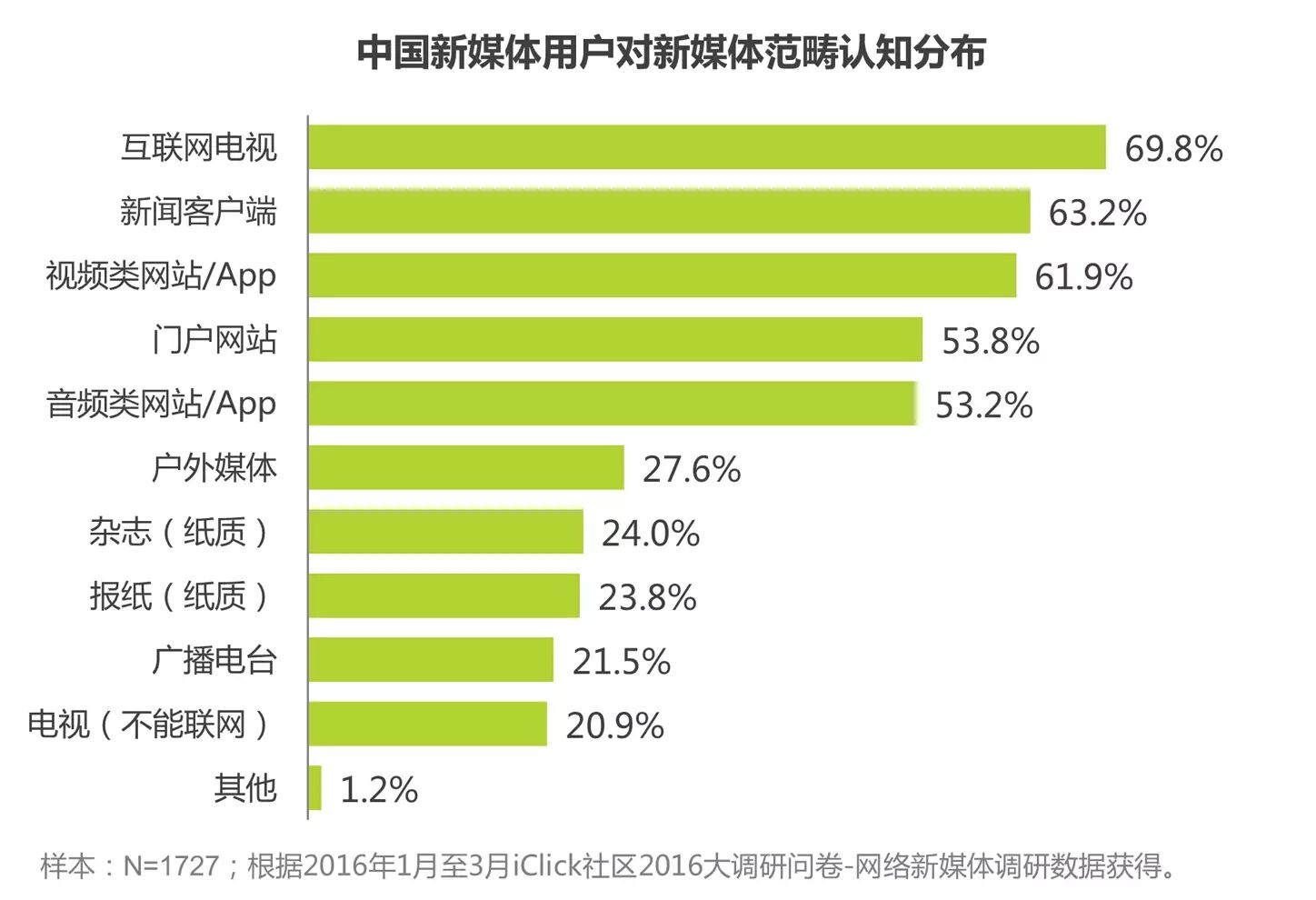 艾瑞调研数据显示,大部分人对新媒体范畴有一个较为合理的认知。但仍旧存在着对新媒体范畴理解的模糊:27.6%的人认为户外媒体是新媒体,24.0%和23.8%的人分别认为纸质杂志和纸质报纸属于新媒体,21.5%的人认为广播电台属于新媒体,20.9%的人认为不能联网的电视属于新媒体。
