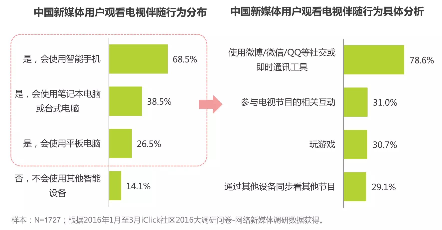 艾瑞调研数据显示,68.5%的新媒体用户在观看视频的同时“玩手机”,38.5%的新媒体用户选择同时使用笔记本电脑或者台式电脑。看电视时“多任务”现象的普遍存在,在观看视频的同时,互联网用户会用其他设备进行在社交网络交流等行为。