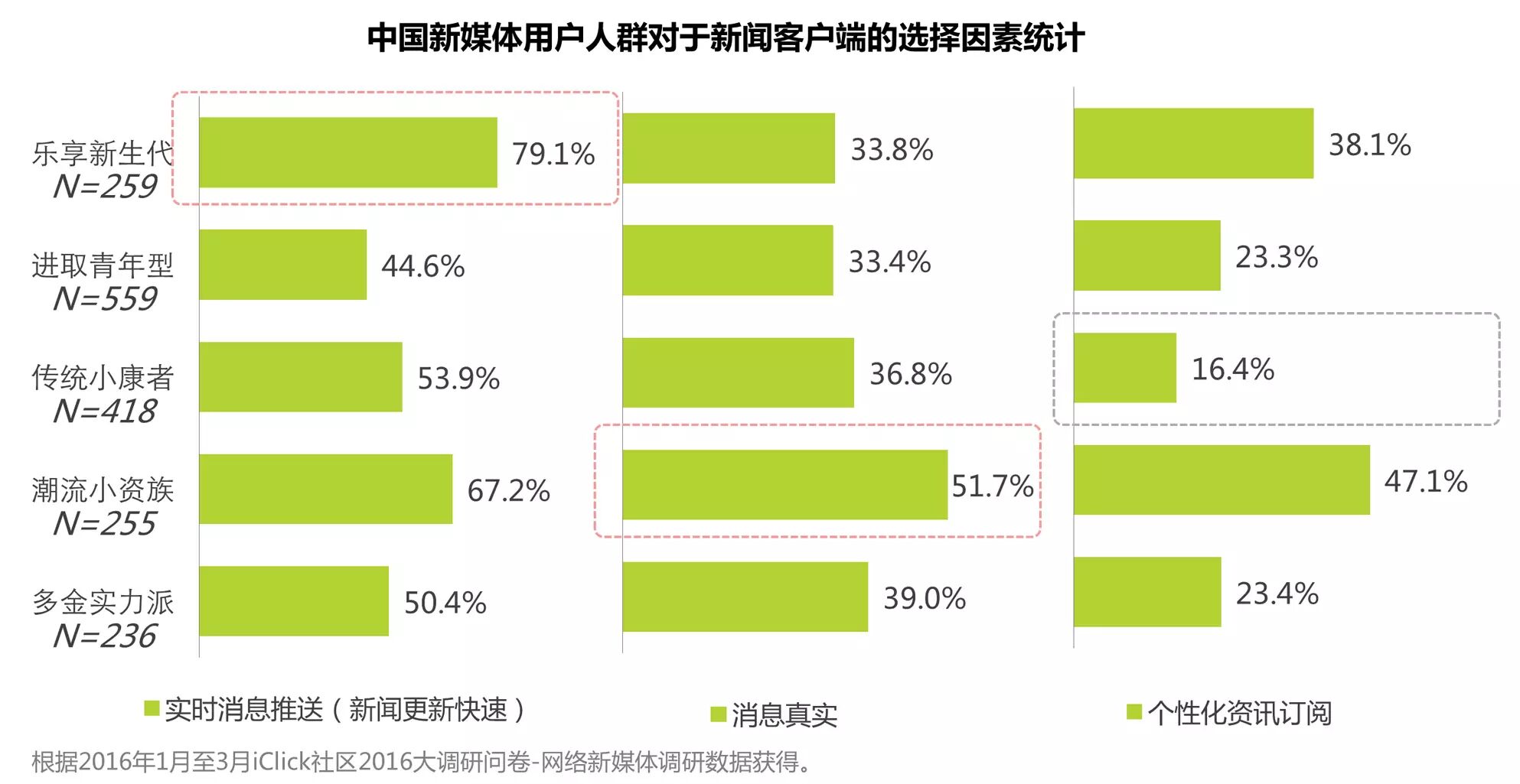 艾瑞调研数据显示,相比于新闻消息的真实性和个性化资讯订阅,乐享新生代在选择新闻客户端时,更关注于消息的实时性;潮流小资族在五类人群中,最关注消息的真实性,占比超过50%。只有16%的传统小康者在选择新闻客户端时会选择关注个性化资讯订阅,占比较低。