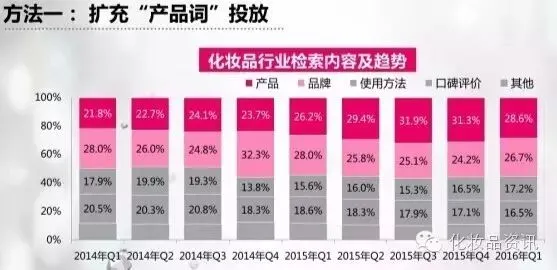 从2014年Q1到-2016年Q1,两年间化妆品行业关于对品牌的检索率呈下降趋势,而对产品的检索率呈上升趋势。