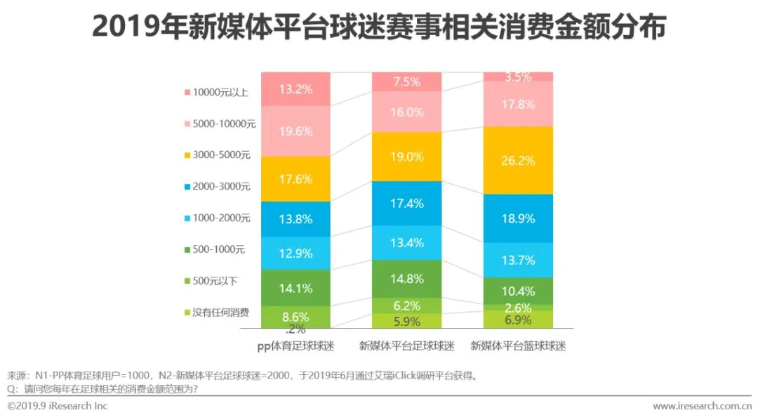 足球球迷在赛事平台会员方面的花销占比更高,篮球球迷则在球衣球鞋周边服装鞋履方面具有较高花销支出。