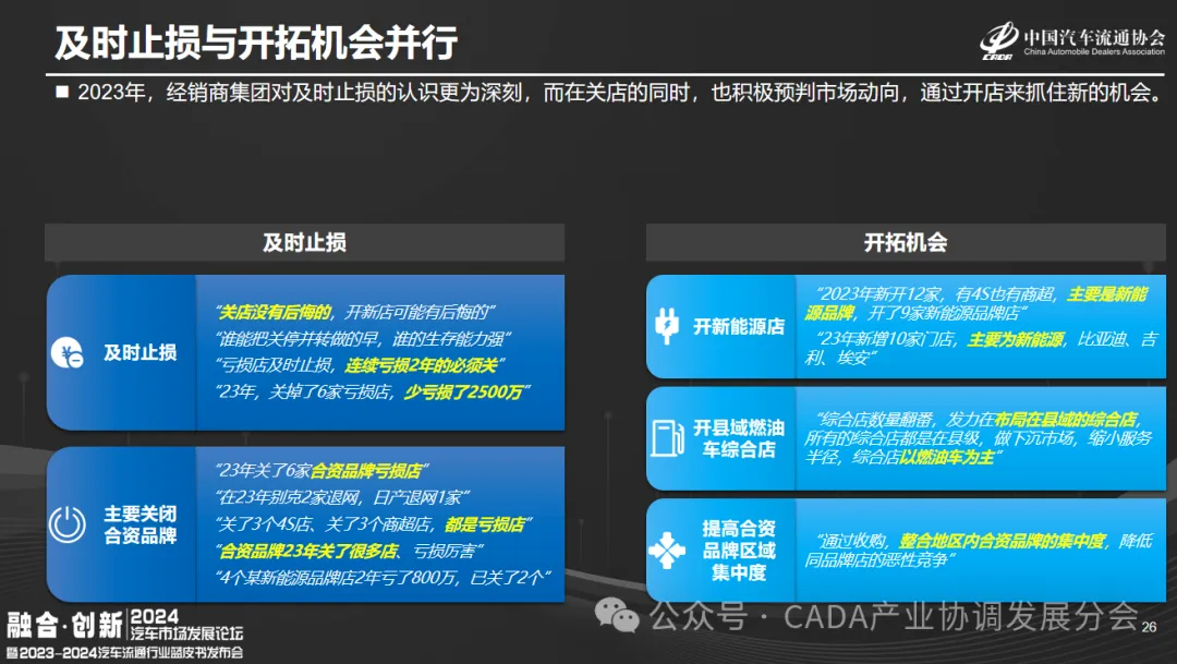 在访谈中,2023年,多数经销商集团更重止损,关店止损的同时预判市场,积极开店抓新机遇。例如,关闭不盈利合资店,连续两年亏损的门店果断关停,不再犹豫。同时,经销商积极拥抱新机遇,开设新能源品牌店、县域燃油车综合店,并趁行业低迷低价收购品牌门店,提升区域集中度,增强对厂家的议价能力。