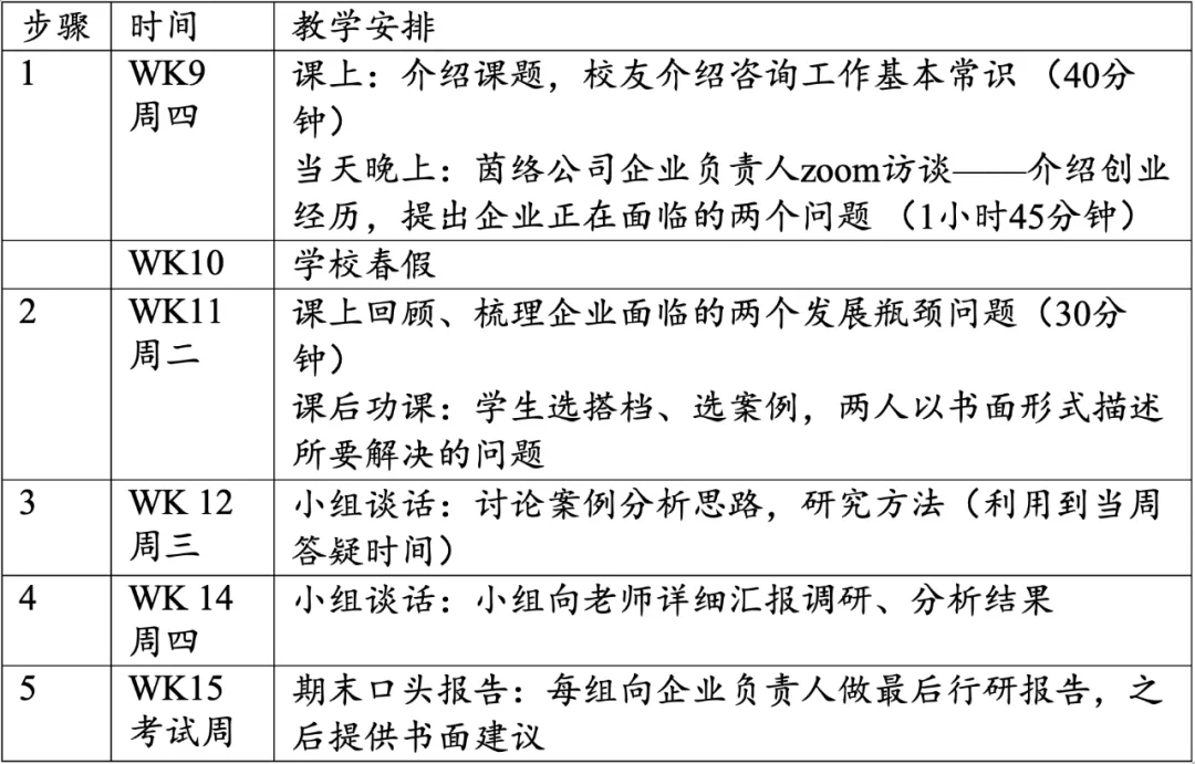 #小贴士二:选修这门课的学生除了两个有投行的实习经历,其余几人都没有在咨询公司实习过。教师邀请了一个之前选修过这门课,刚拿到麦肯锡offer的大四华裔学生,用半节课(40分钟)的时间给学生做了一个工作坊,介绍咨询公司实习生的基本工作内容,实习心得,这个学生还用自己参加过的一个真实案例向学生展示跟客户见面时应该问哪些问题。因为主讲人是学生的学姐,分享的是自己亲身经历,所以学生对这次工作坊的反馈非常好。