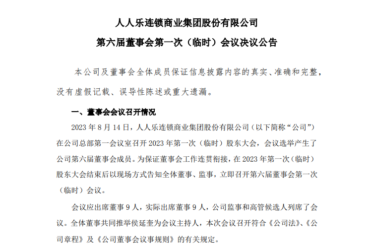 8月15日,人人乐连锁商业集团股份有限公司发布公告,在2023年第一次(临时)股东大会上,董事会同意选举侯延奎为人人乐第六届董事会董事长;选举蔡慧明为人人乐第六届董事会副董事长,任期三年,自本次董事会审议通过之日起至本届董事会届满。根据人人乐章程规定,董事长即为人人乐法定代表人,人人乐法定代表人将变更为侯延奎。