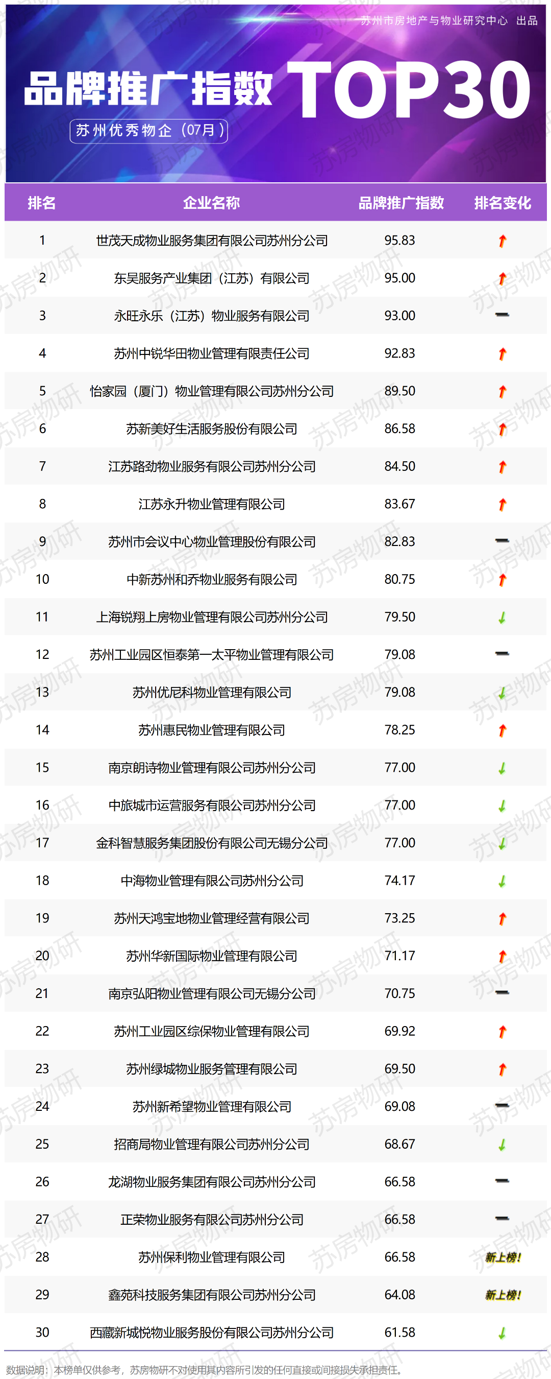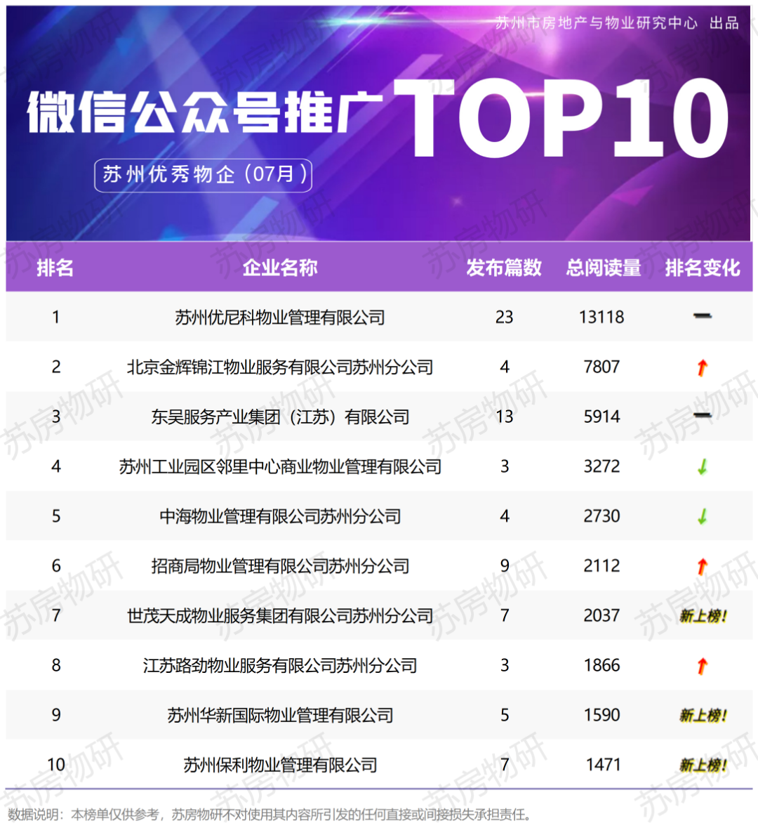 本月,苏房物研继续发布“2023年苏州物业企业品牌推广指数TOP30”榜单(2023年7月)以及“2023年苏州物业企业微信公众号推广TOP10”榜单(2023年7月)。