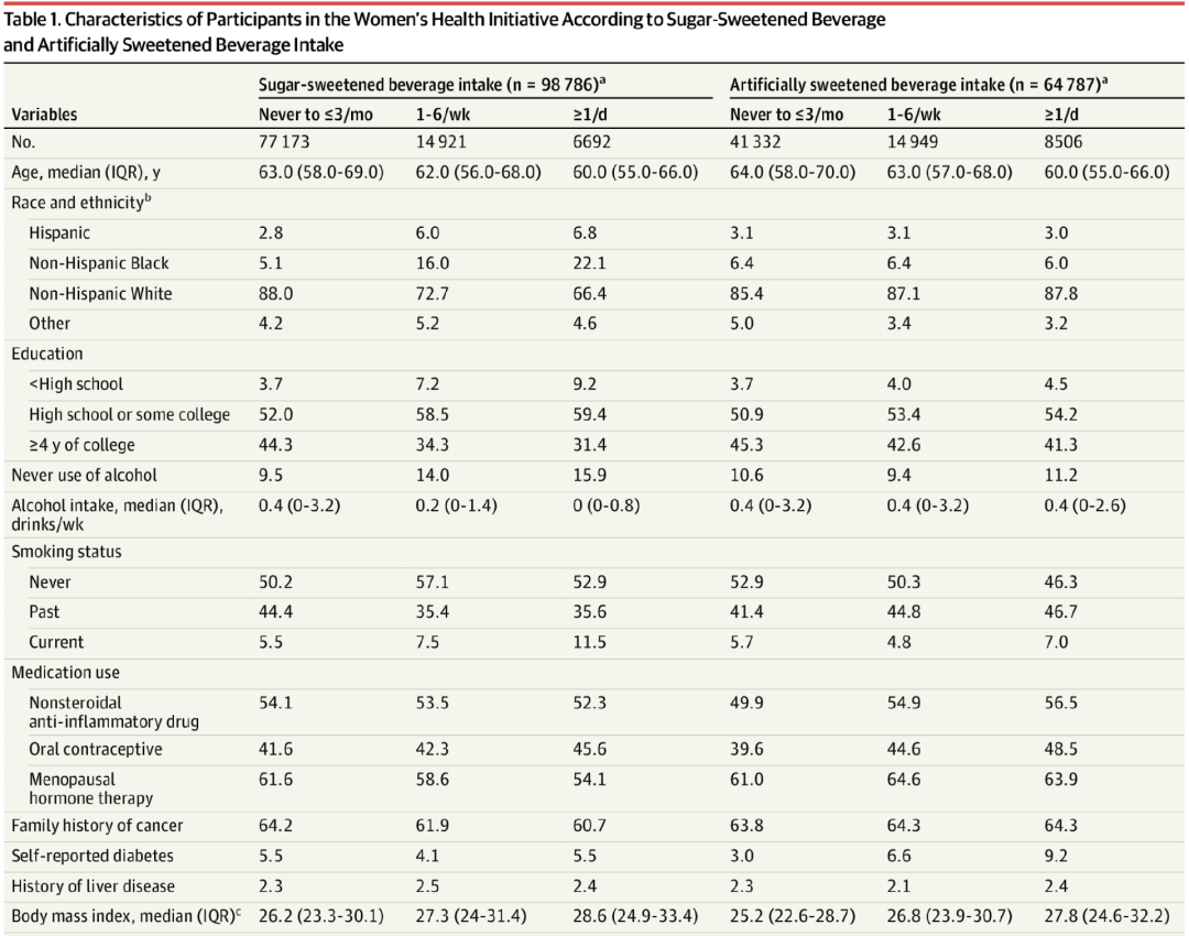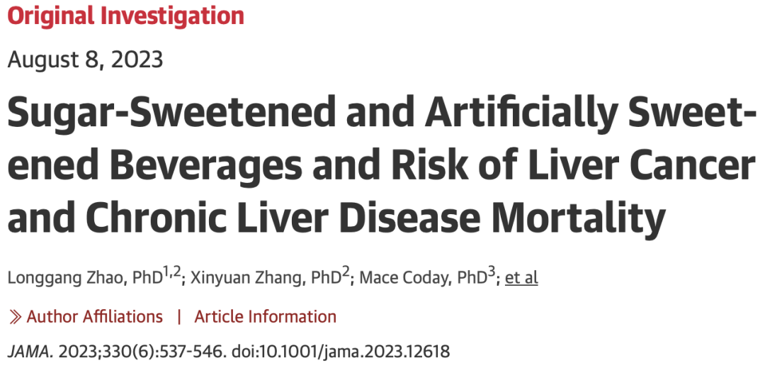 doi:10.1001/jama.2023.12618先前的流行病学报告显示,含糖饮料的摄入与乳腺癌、结直肠癌以及前列腺风险之间存在显著的正相关性,但与肝癌风险的潜在联系仍悬而未决。为探明其中的利害关系,研究者从大型前瞻性数据库妇女健康倡议(WHI)中收集到98,786名绝经后妇女,年龄在50-79岁之间,并基于食物频率调查表统计出普通软饮料(非代糖)和果味饮料(非纯果汁)饮用量。含糖饮料的总摄入量被定义为普通软饮料和果味饮料的总和。基于此,全部的98,786名参与者被分为三组:77,173名参与者从不或少量饮用含糖饮料(≤3份/月);另有14,921名参与者每周饮用1-6份含糖饮料;约有6.8%为含糖饮料狂热粉,每日摄入量≥1份(1 serving≈1罐,355mL左右)。