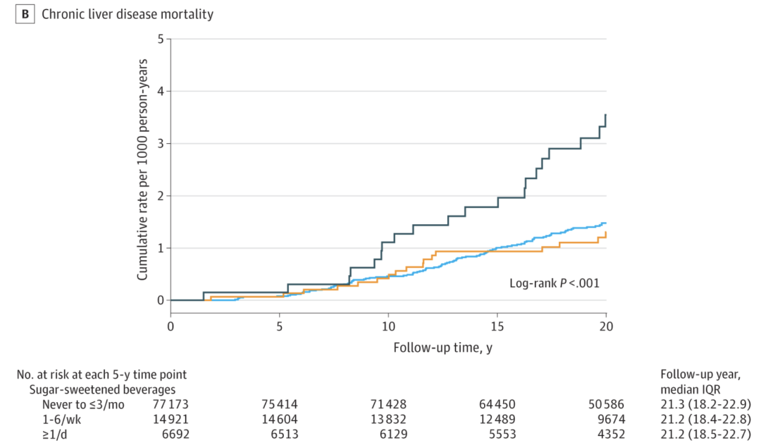 在中位数20.9年的随访后,累计记录到207例新发肝癌病例和148例慢性肝病死亡的情况。结果显示:每天饮用≥1份含糖饮料的绝经后妇女的肝癌发病率为18例/10万人年,而相比之下,每月≤3份含糖饮料的肝癌发病率仅为10.3例/10万人年。与几乎不饮用含糖饮料的相比,每日至少一杯软饮料或果味饮料与罹患肝癌的风险升高66%和71%有关。