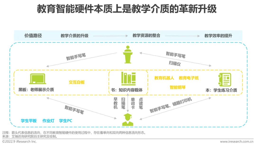 从狭义上理解,教育是知识和文化的传承,而对教育智能硬件来说,真正有意义的不仅是信息和内容,其价值同样体现在教学介质的属性及由此带来的可能性和教学变革。脱离数字技术的影响,从传统的教育场景来看,在师生之间充当教学介质的主要是黑板、书、本三类,“黑板”主要作为老师的展示介质,“书”主要作为知识内容的载体,“本”主要作为学生练习的介质。现有教育智能硬件基本上可以视为是对这三类教学介质的革新升级,其价值路径首先体现在教学介质的升级,其次是教学资源的整合,最后是教学效率的提升。举例来说,如交互白板首先是黑板的数字化升级,其次是课件、教学工具的资源整合,最后是对师生课堂互动效率的提升。又如扫描笔首先是词典的数字化形态,其次是多版本词典、英语教材的资源整合,最后是学生查词翻译、发音练习效率的提升。