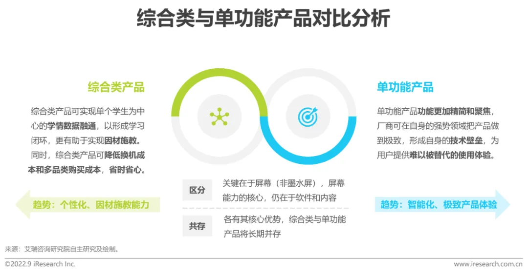 在教育数字化改革的时代背景下,教育智能硬件是必要的工具和载体。一方面,其作为教学资源终端,可实时为每个用户提供教学内容和服务,助力实现规模化教育。另一方面,其作为数据融通的个人终端,依托大数据分析技术,可成为最懂学生的智能终端,助力每个学生的个性化培养。规模化与个性化的结合,使得教育智能硬件或成为教育数字化发展的标配。根据功能丰富程度的不同,可将教育智能硬件分为综合类和单功能类产品。综合类产品如学生平板,可实现单个学生为中心的学情数据融通,更有助于实现因材施教。单功能产品如扫描笔,产品功能更加精简和聚焦,可在扫描识别领域做到极致的使用体验。综合类与单功能类各有其核心优势,未来或将长期并存。