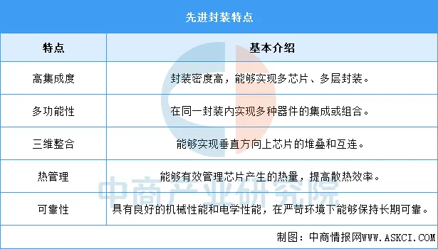 先进封装是指一种处于当时最前沿的封装形式和技术,它采用先进的技术和工艺,将芯片和其他元器件进行封装,以提高其性能、功能和可靠性。这种封装方式相较于传统封装具有更高的集成度、更小的尺寸、更低的功耗和更高的可靠性。先进封装具有高集成度、多功能性、三维整合、热管理、可靠性等特点,具体如图所示: