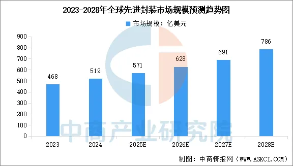 “后摩尔时代”制程技术突破难度较大,先进封装技术的发展成为延续及超越摩尔定律、提升系统性能的关键。中商产业研究院发布的《2025-2030年中国封装测试行业深度分析及发展趋势研究预测报告》显示,2024年全球先进封装市场规模达519.00亿美元,同比增长10.90%。中商产业研究院分析师预测,2025年全球先进封装市场规模将达到571亿美元,2028年达到786亿美元。