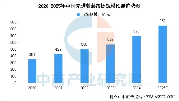 得益于5G、物联网、AI等新兴技术的需求,以及HPC与存储解决方案需求的日益增加,中国先进封装市场规模快速增长。中商产业研究院发布的《2025-2030年中国封装测试行业深度分析及发展趋势研究预测报告》显示,中国先进封装市场规模由2020年的351亿元增长至2024年的698亿元,同期年复合增长率为18.7%。中商产业研究院分析师预测,2025年中国先进封装市场规模将达到852亿元。