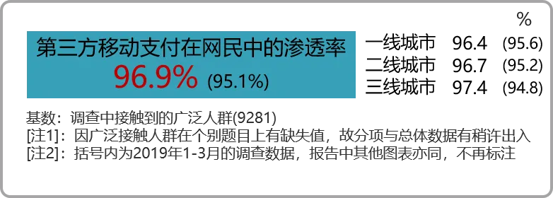 调查显示,移动支付在手机网民中的渗透率(即在最近三个月内使用过的比例)为96.9%,相较2019年4月(即上期)调查(95.1%)仍保持高位和增长势头。