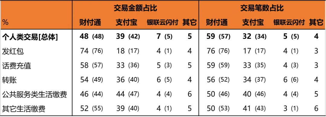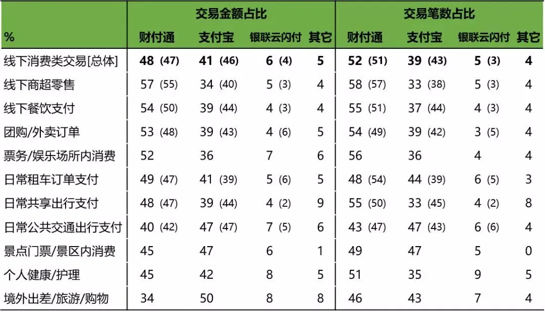 财付通在线下消费类场景的支付优势小幅提升。调查显示,财付通在线下支付场景的交易金额和笔数占比分别为48%和52%,维持着对支付宝(占比分别为41%和39%)的领先优势,且从持续调查数据看差距在小幅扩大。