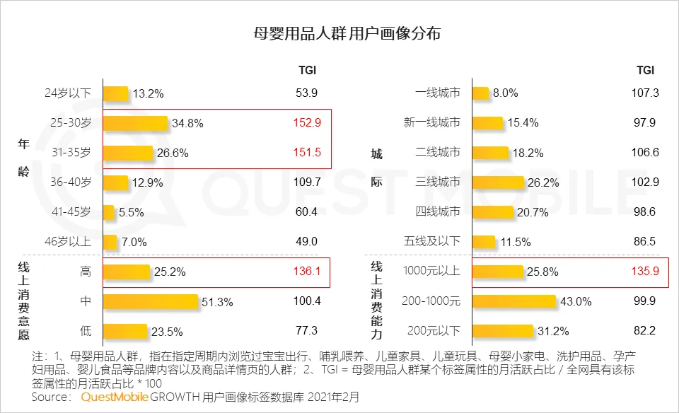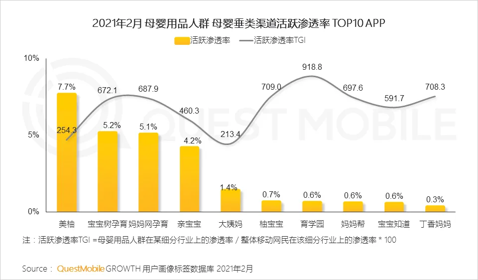 6、母婴用品人群对育儿母婴垂类APP的活跃渗透率TGI整体较高,通过垂类渠道获取专业育儿知识、开展社区交流