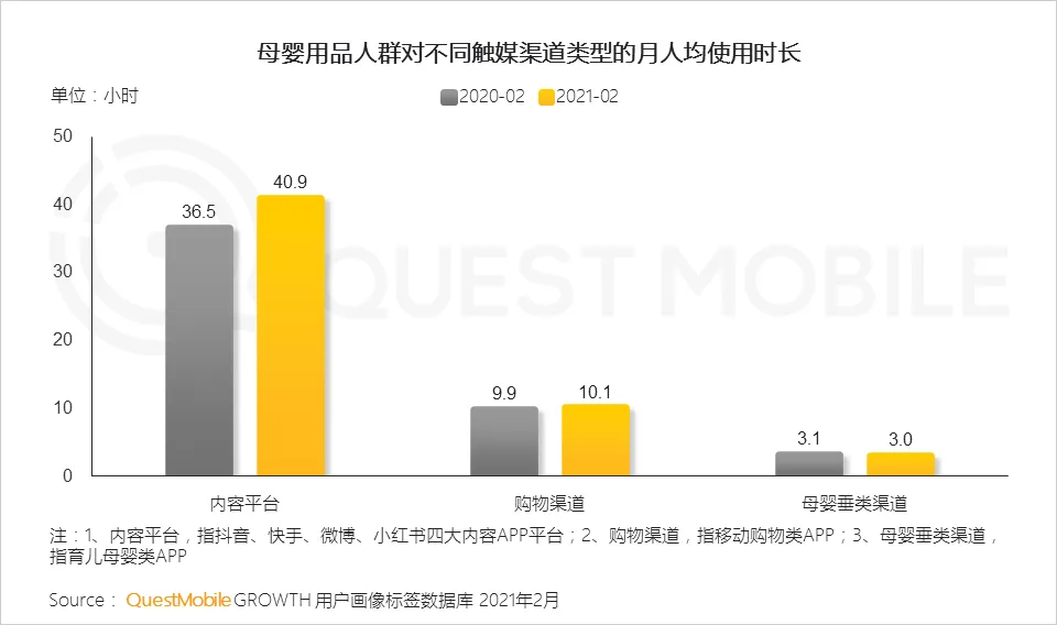 3、内容平台是母婴用品人群最花费时间的渠道,平均每月在“刷内容”上花费40个小时,远超购物和垂类渠道