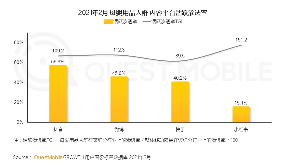 4、抖音、微博、快手是母婴用品人群消遣时间的主要去处,小红书的活跃渗透率TGI最高