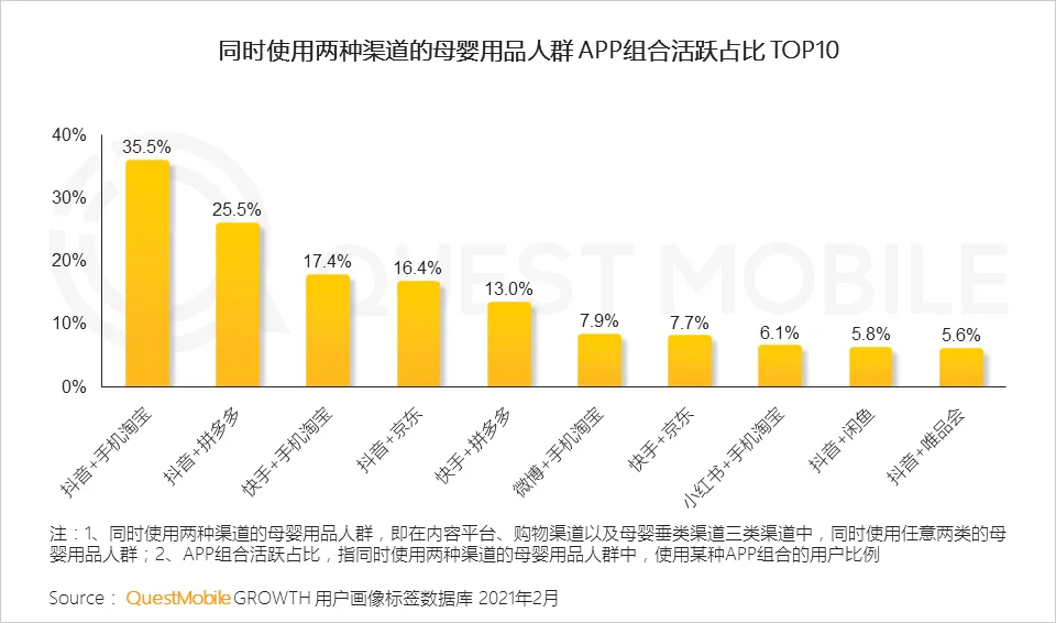 5、母婴用品人群在手机淘宝的活跃渗透率最高,其次是拼多多、京东,二手交易平台闲鱼也是其获取高性价比商品的主要来源