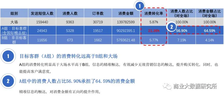 目标客群的消费触达转化为21.36%,远高于大场活动的转化数据5.87%和测试对比组的转化数据5.77%;且目标客群的消费能力(=消费金额占比/消费人数占比)高于整体。