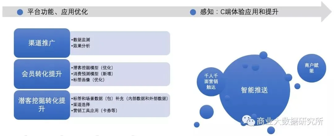 业务层面则是构建基于数据驱动的营销闭环实践:在消费升级需求下、结合大数据赋能和人工智能技术的应用,通过“人、货、场”的重构,实现降低成本、提高效率、提升消费者体验的目标。