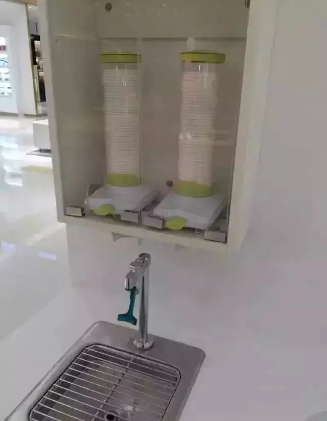 直饮水机遍布商场,并采用密封隔离的一次性纸杯