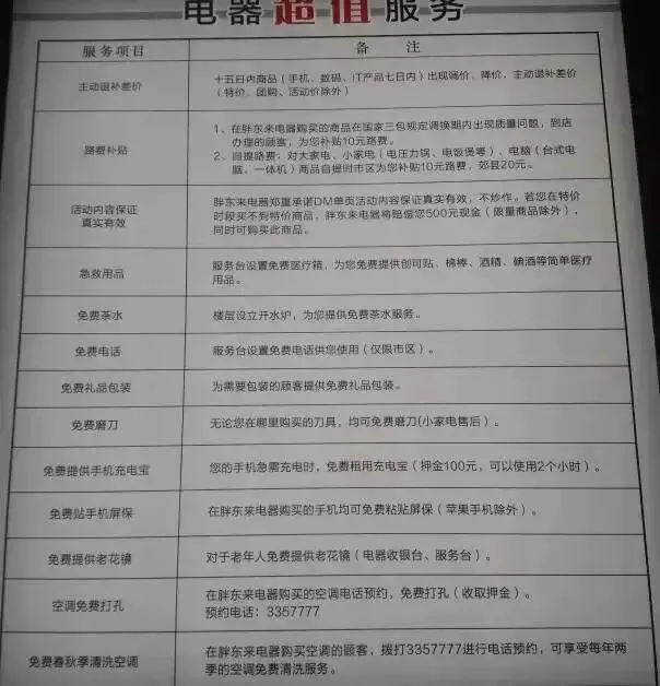 胖东来建立了较为完善的售前、售中、售后服务体系,服务项目多达上百项,而售后服务就有18项免费,如免费存车、免费打气、免费提供修车工具、免费存包、免费给手机充电、免费送货、免费维修、免费干洗、免费熨烫、免费锁边、免费修鞋等。
