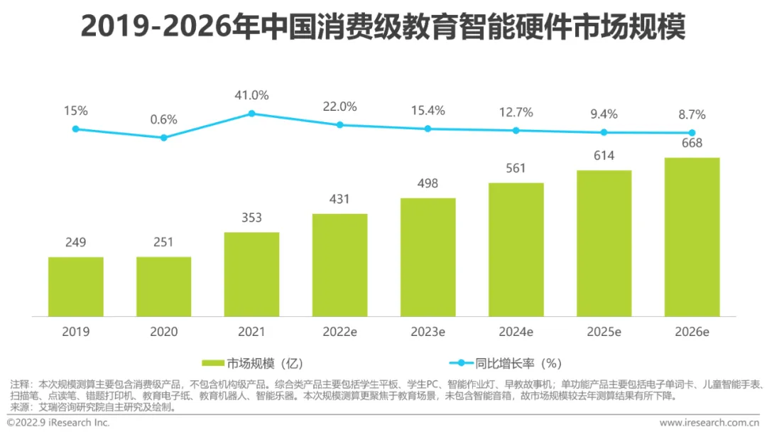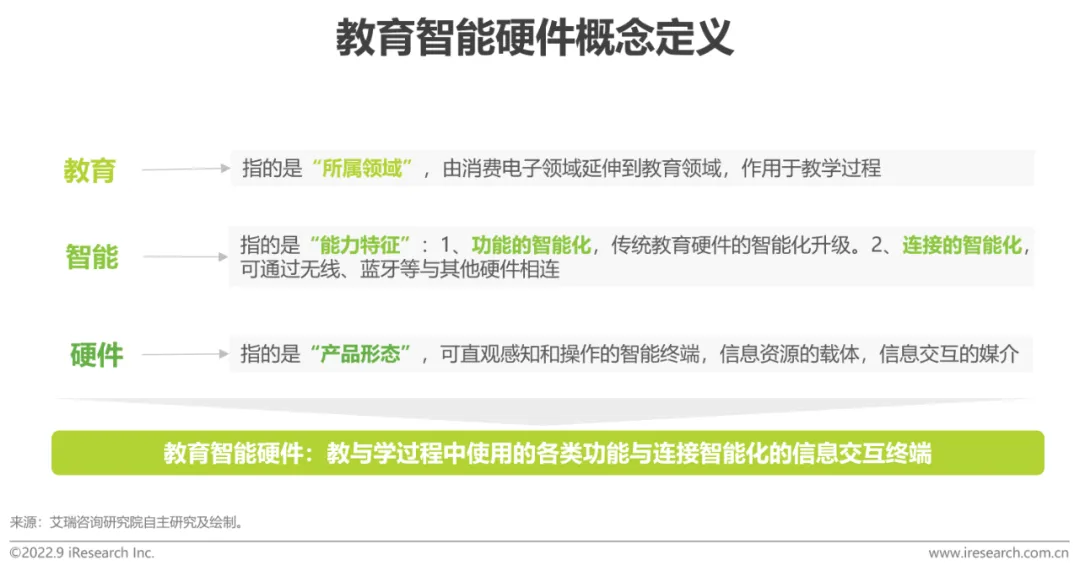 “教育”指的是“所属领域”,教育智能硬件是由消费电子领域延伸到教育领域,并作用于教学过程的产品;