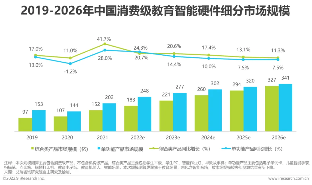 在教育数字化改革的时代背景下,教育智能硬件是必要的工具和载体。一方面,其作为教学资源终端,可实时为每个用户提供教学内容和服务,助力实现规模化教育。另一方面,其作为数据融通的个人终端,依托大数据分析技术,可成为最懂学生的智能终端,助力每个学生的个性化培养。规模化与个性化的结合,使得教育智能硬件或成为教育数字化发展的标配。根据功能丰富程度的不同,可将教育智能硬件分为综合类和单功能类产品。综合类产品如学生平板,可实现单个学生为中心的学情数据融通,更有助于实现因材施教。单功能产品如扫描笔,产品功能更加精简和聚焦,可在扫描识别领域做到极致的使用体验。综合类与单功能类各有其核心优势,未来或将长期并存。