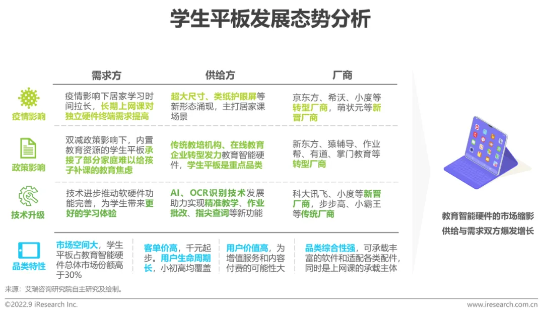 学生平板在当下的火热受到疫情、政策、技术多方因素的复合影响,可看作教育智能硬件市场火热的缩影,学生平板也具有承接用户高需求、市场高期待的品类特性。在疫情、政策、技术推动下,供需双方相互影响推动了品类的火爆,传统厂商、转型厂商、新晋厂商动作频频。如“双减”政策影响下,从需求方来看,内置教育资源的学生平板成为了部分家庭教育焦虑转移的出口。从供给方来看,教育智能硬件成为了传统教培机构、在线教育企业转型发力的方向,而学生平板因其市场空间大、客单价高、综合性强等特性,成为各厂商关注的重点品类。
