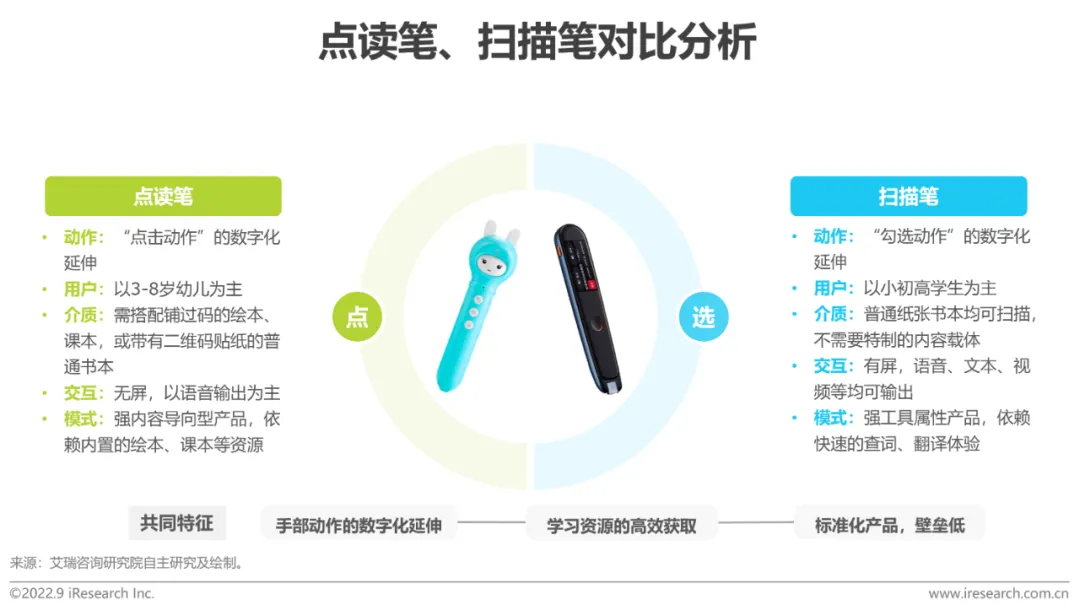 点读笔和扫描笔都是对人手部动作的数字化延伸,点读笔侧重“点”的动作,扫描笔侧重“选”的动作,其核心都是借助简单手部动作进行高效的数字资源获取,产品本身的技术、内容壁垒都较低。从用户范围上来看,点读笔以3-8岁的幼儿为主,需搭配绘本、课本或带有二维码贴纸的普通书本进行学习,以语音输出为主。扫描笔用户范围更广泛,以小初高学生为主,且介质依赖较弱,交互形式更多样。在相似的产品逻辑下,随着OCR识别等技术应用的进一步成熟,作为新品类的扫描笔对作为旧品类的点读笔在功能上进行了进一步的拓展延伸、用户群体进一步扩大、交互形式也更加丰富。从当下的趋势来看,扫描笔对点读笔呈现出替代趋势,这也体现在点读笔的销量趋于下滑,而扫描笔的销量持续上升。