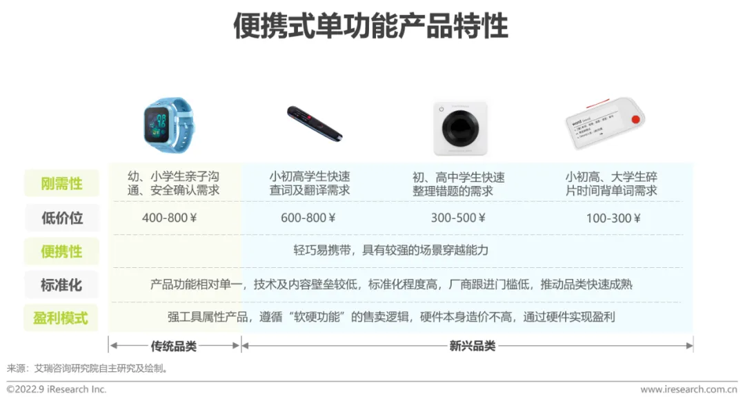 传承体现在对传统硬件品类价值内核的发扬借鉴。相比于学生平板,儿童智能手表功能更加聚焦、价格更低,且轻便易携带。错题打印机、扫描笔、电子单词卡等传承了这一特性,寻找到更多的刚需痛点,作为兼具刚需、便携、低价特点的单功能品类,接二连三地持续崛起。此为“传承”。