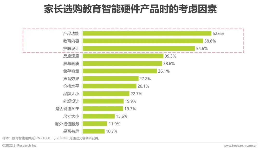 在选购教育智能硬件时,家长最关注产品的功能,即产品能解决哪些问题、应用在哪些场景。除了产品功能外,家长最关心产品自带的教育内容,确保孩子能够学习到准确、高质量的知识,不走弯路。相对来说,家长对于硬件本身的关注度主要集中在护眼属性上,对于外观设计、是否能连接APP、尺寸大小、是否有屏的关注度较低。这主要因为视觉问题具有较强的不可逆性,长时间使用电子产品是孩子视觉问题的成因之一,因此家长在选购智能硬件产品时会特别考虑产品的护眼属性。