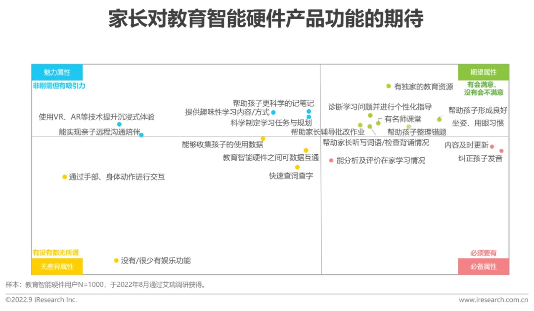 基于KANO模型,本次调研从满意度-提供这一功能后用户的态度,以及必要性-缺乏这一功能后用户的态度这两方面,双重判断用户对以下产品功能的期待。其中,期望属性为用户最期望的产品功能点,魅力属性是锦上添花的功能点,必备属性为用户认为一定要有的功能点,无差异属性是用户“不感冒”的功能点。具体来看,用户对于教育内容的期待度较高,期望教育智能硬件产品自带独家的教育资源、有名师课堂;除此以外,用户对习惯管理(如坐姿、用眼习惯)、个性化学习指导等方面也有较高期待。