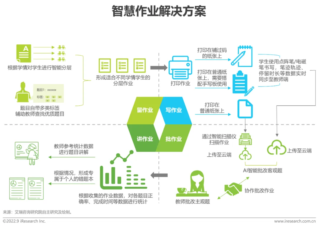 智能手写笔主要指面向学生群体,通过点阵、电磁等技术,对普通纸张上的书写痕迹进行信息采集的智能笔。点阵笔和电磁笔分别通过暗码识别和电磁感应等技术实现笔迹数据的高效、实时采集,具有不改变自然书写习惯、视力保护、常态化数据采集、应用场景丰富等诸多优势。目前,江西省已实现了老师端作业批改的大规模应用,实现了作业的减负增效,全省覆盖率达80%,成功入选教育部“双减”典型案例,用事实验证了点阵笔应用于智慧作业场景的可行性。随着OCR识别技术、点阵铺码技术的成熟,教辅、作业铺码成本、智能笔制造成本的进一步降低,更大范围的规模化应用将成为可能。