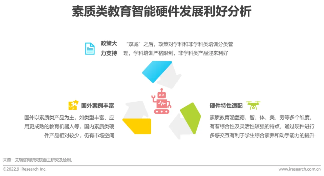 素质类教育智能硬件的发展利好是由政策支持、硬件特性、国外案例三个方面共同影响下形成的。首先在政策支持方面,“双减”之后,政策对学科和非学科类培训分类管理,学科培训严格限制,非学科类产品迎来利好,政策鼓励地方将综合素质评价作为高中阶段的招生录取标准之一;其次在硬件特性方面,素质教育涵盖德、智、体、美、劳等多个维度,有着综合性及灵活性较强的特点,通过智能硬件进行多感交互更有利于学生综合素养和动手能力的提升;最后在可借鉴的案例方面,国外以素质类产品为主,如类型丰富、应用更成熟的教育机器人等,国内素质类硬件产品相对较少,仍有市场空间。