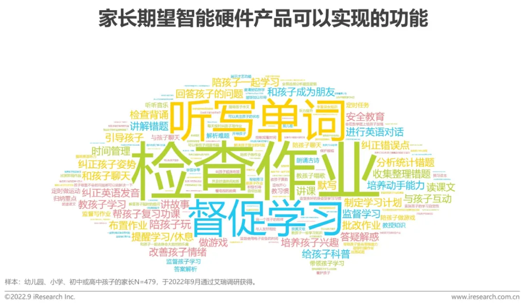 艾瑞咨询于2022年9月对479位孩子上幼儿园、小学、初中或高中的家长进行开放式的问卷调研,了解其理想的教育智能硬件产品特点(不考虑技术是否能实现)。调研结果显示,家长最期望有相关产品或服务可以代替自己的“工作”,帮助自己检查孩子作业、听写单词以及督促孩子学习、写作业。此外,家长期待教育智能硬件产品可以成为孩子的“朋友”,以同辈的角度帮助孩子树立正确的价值观,适时调节孩子的不良情绪,定时向家长反馈孩子可能存在的各类问题。除日常学习需求外,家长还期望教育智能硬件产品可以对孩子进行安全教育,科普自然人文知识。