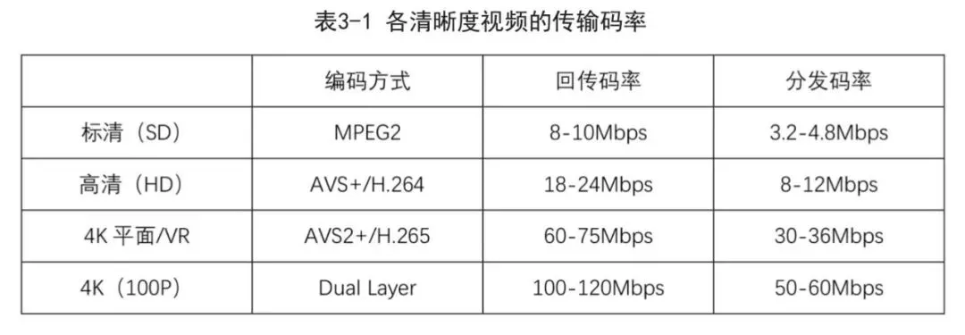 视频已经成为当今主流的媒体传播形式,随着技术的发展,视频的分辨率由标清、高清向超高清发展,视频的观看方式由平面向VR全景发展。各种类型视频的通信带宽需求如表3-1所示: