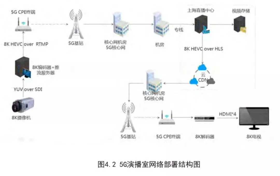 本次直播面向5G端到端的云管端协同组网,采用专业级8K摄像机采集视频,视频流经由5GCPE终端上行至本地5G核心网络,通过云专线与公有云实现互通,数据传输距离长达400公里,直播数据流全部注入上海直播中心进行分发。并进一步通过5G网络实时传至8K超高清电视机,整体性能指标满足各类重大活动的5G+8K直播的需求。