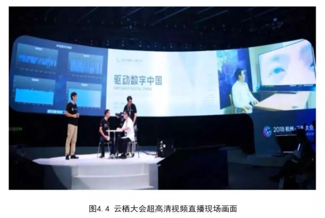 2018年9月,国内多家公司联合在杭州云栖大会上完成了首次专业级5G+8K视频直播应用,实现了传统视频直播体验的升级。此次应用的总体设计以实现5G+8K直播应用为核心,通过产业链伙伴协同合作,合理运用5G网络资源,实现5G与8K两项新技术的联合应用示范。主要包括头端设备(8K摄像机、8K编码器)、网络传输设备(5G终端及组成5G基站、专线的各种网络设备)、播放设备(8K解码器、8K电视)等多个环节的协同配合。5G终端下载速率超过800Mbps,可以满足码率为300Mbps的8K视频信号传输,并实现多项延展功能。