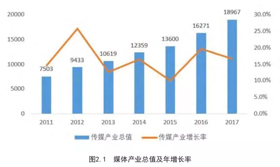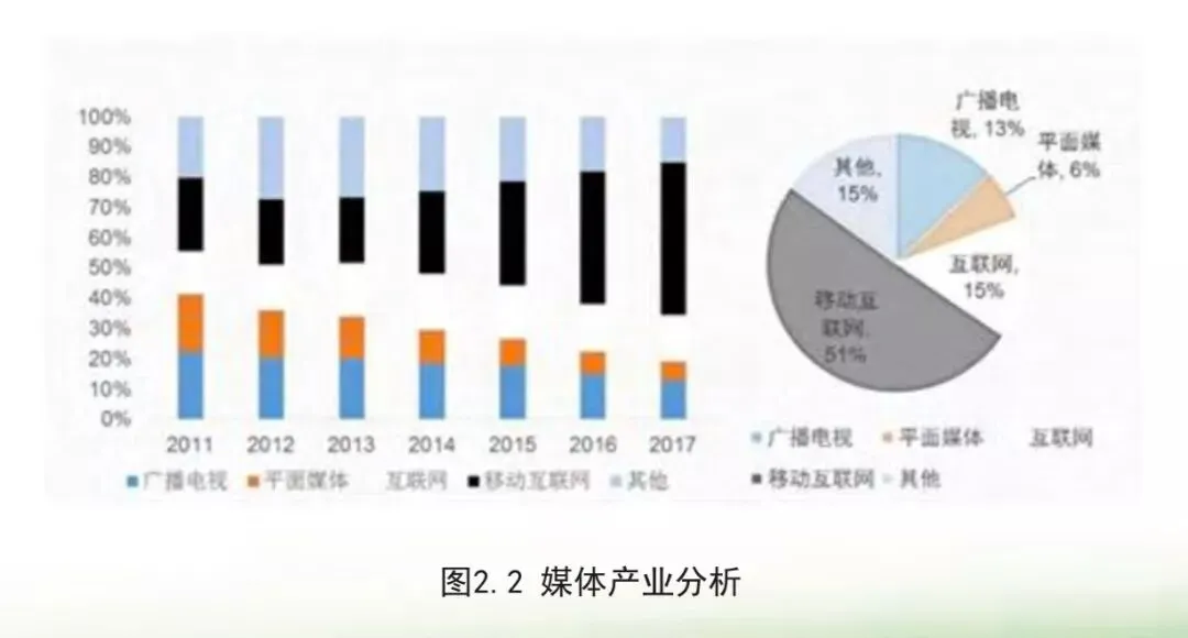 2011年到2017年,媒体行业的发展迅猛,年复合增长率14.2%,产业体量已经达到1.9万亿。其中,广播电视等传统媒体在媒体总产业体量的新媒体业务分析占比从2011年起逐年下降,目前已低至13%。新媒体(互联网及移动互联网)在媒体总产业体量的占比从39%提升至66%。
