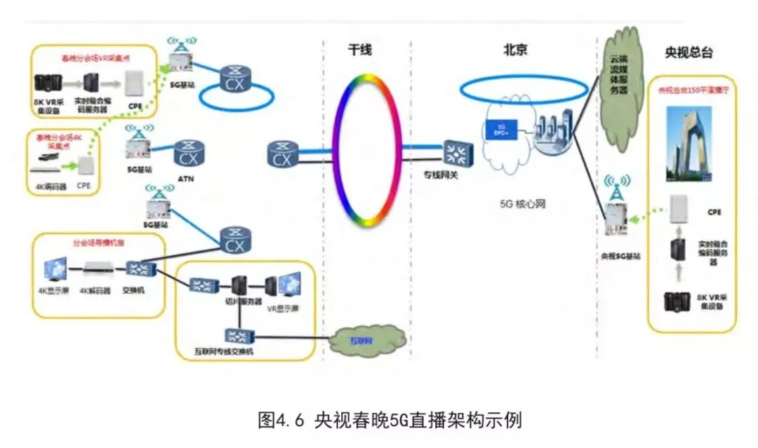 2018年春节期间,春晚分会场采用5G网络超高清视频实时传输。通过5G网络,央视将春晚分会场拍摄的4K实时信号,成功传回至北京中央广播电视总台5G媒体应用实验室机房,同时总台拍摄的北京景观信号也成功经过5G网络传输至分会场导播机房,两路信号均在分会场导播机房的4K大屏上予以实时呈现。